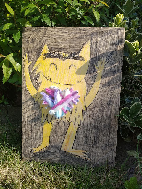 - Zeichne das Farbenmonster auf das Holz. Lege dafür die Vorlage auf das Holz und zeichne die Linien mit einen Kuli nach (Das Herz wird nur mit kleinen Punkten (an Abstand denken) markiert (hier kommen später die kleinen Nägel rein).